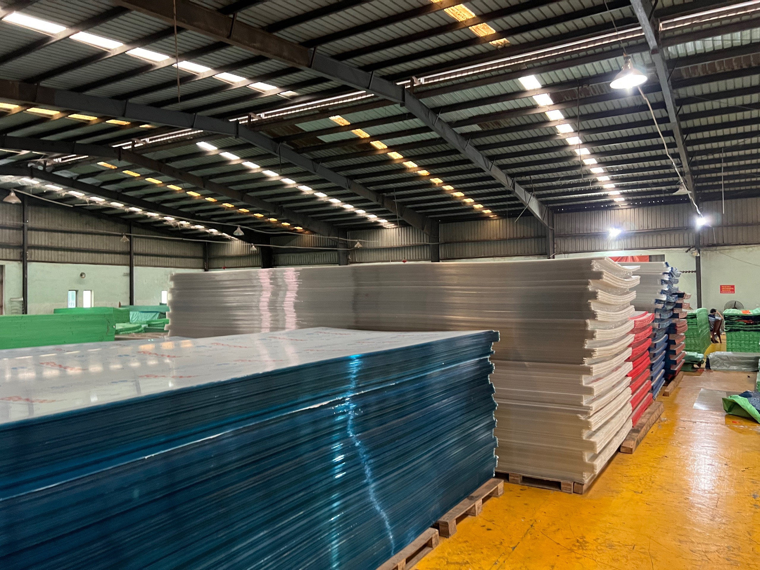 Tấm Polycarbonate cần được đặt trên pallet hoặc mặt phẳng chắc chắn, đảm bảo lực phân bố đều. Điều này giúp giữ nguyên hình dạng ban đầu, hỗ trợ quá trình thi công chính xác hơn.