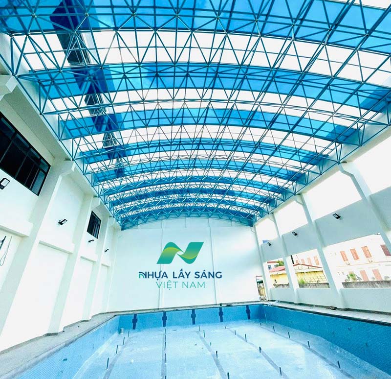 Tấm lợp Poly kết hợp 2 màu xanh hồ và trắng trong cho khu vực bể bơi