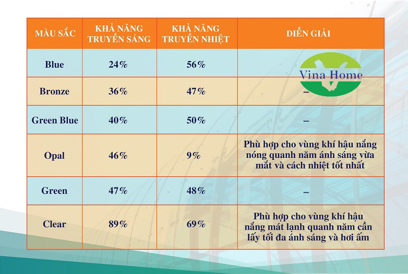Quý khách có thể tham khảo thêm bảng thông số truyền sáng – truyền nhiệt của từng màu để thấy rõ sự khác biệt này. Việc hiểu rõ đặc điểm từng màu sẽ giúp đưa ra lựa chọn chính xác, cân bằng giữa nhu cầu chiếu sáng, thẩm mỹ và khả năng giảm nóng cho công trình.