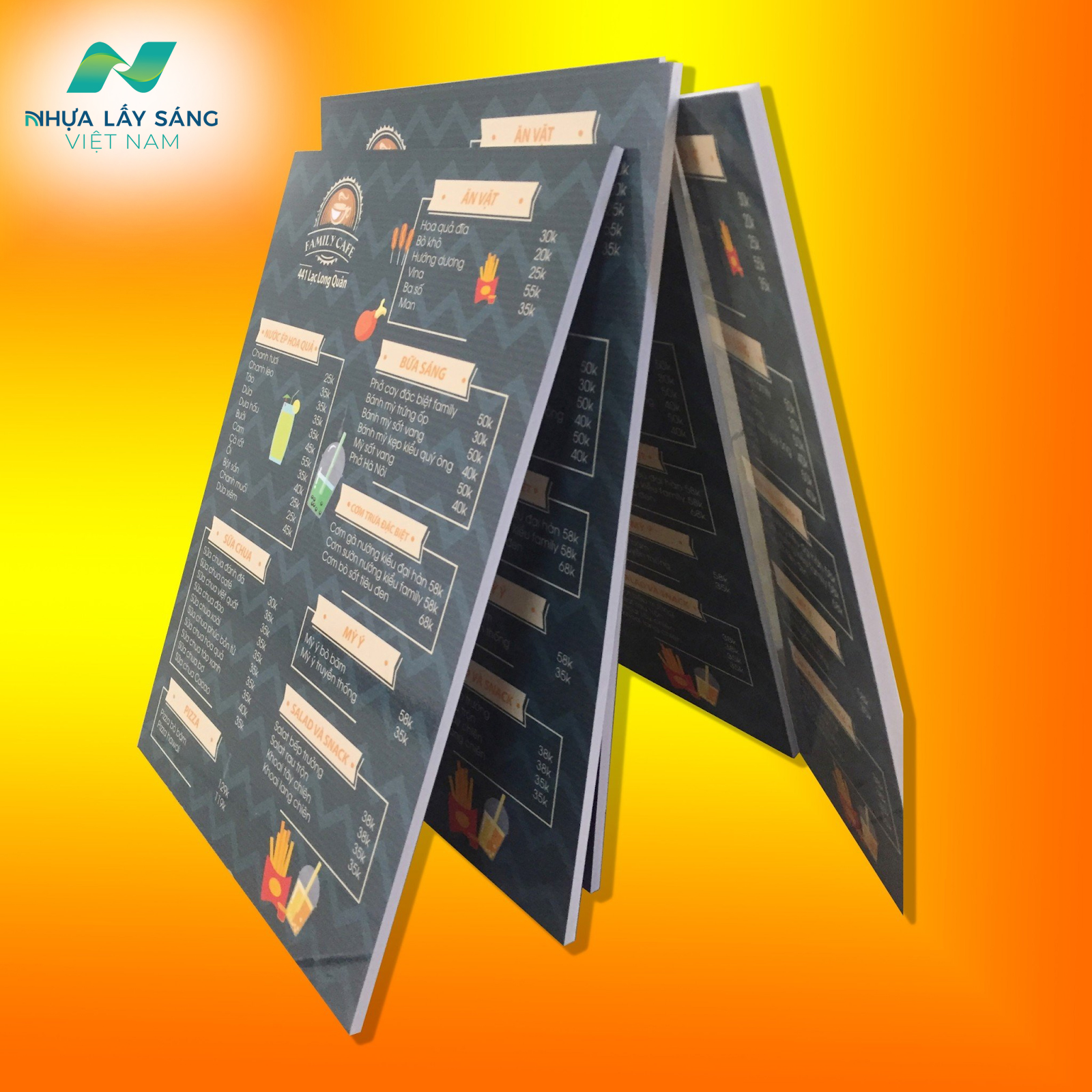 - Làm Bảng Kê, Menu Để Bàn Trong Nhà Hàng/Quán Ăn: In và bồi decal làm menu, bảng giá, hoặc bảng thông báo khuyến mãi, dễ dàng vệ sinh và thay thế.