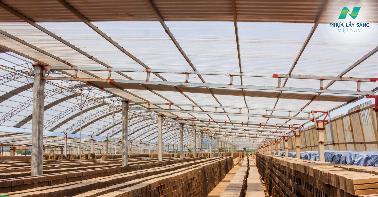 Làm Mái Che Lấy Sáng Cho Lò Gạch: khả năng lấy sáng gần tuyệt đối giúp mái che Composite vừa đảm bảo che mưa nắng tốt vừa giúp đảm bảo quy trình sấy gạch nhanh chóng như khi để ngoài trời.