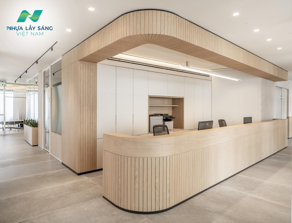 Tại Sảnh Lễ Tân: Tấm ốp Nano vân đá hay vân gỗ thường được sử dụng để ốp mặt dựng quầy hoặc backdrop logo, mang lại vẻ ngoài sang trọng, bề thế không kém gì đá cẩm thạch thật hay gỗ thật. Việc này giúp thể hiện uy tín và tạo ấn tượng mạnh mẽ về sự chuyên nghiệp của doanh nghiệp.