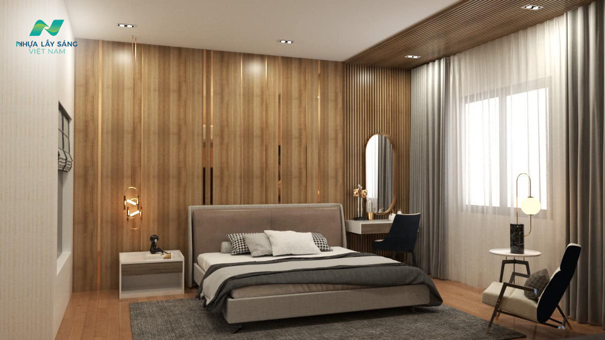 2. Phòng ngủ hiện đại, ấm cúng với tấm nhựa ốp tường Nano vân gỗ